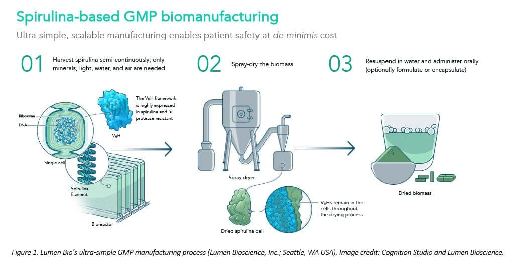 A spirulina-based GMP process, however, can simplify things. Because spirulina GMP cell lines are more stable and easier to engineer, cell-line establishment is much faster and cheaper. The growth media is a simple salt-water mix, and sterility is not required because the biomanufacturing host organism (spirulina) is a photosynthetic extremophile with a preferred growth medium hostile to most potential contaminants. Spirulina is a safe mass-market food (i.e., “GRAS status”) so downstream purification is not required for oral therapies. Even for intranasal applications, relatively little handling is required.